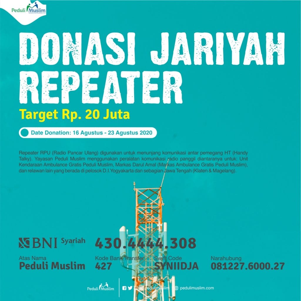 Maka kami mengajak kaum muslimin sekalian untuk ikut serta dalam donasi jariyah pendirian dan proses pengurusan Repeater ini yg insyaaAllah nantinya menggunakan frekuensi resmi/ legal ini. Donasi dapat disalurkan melalui: