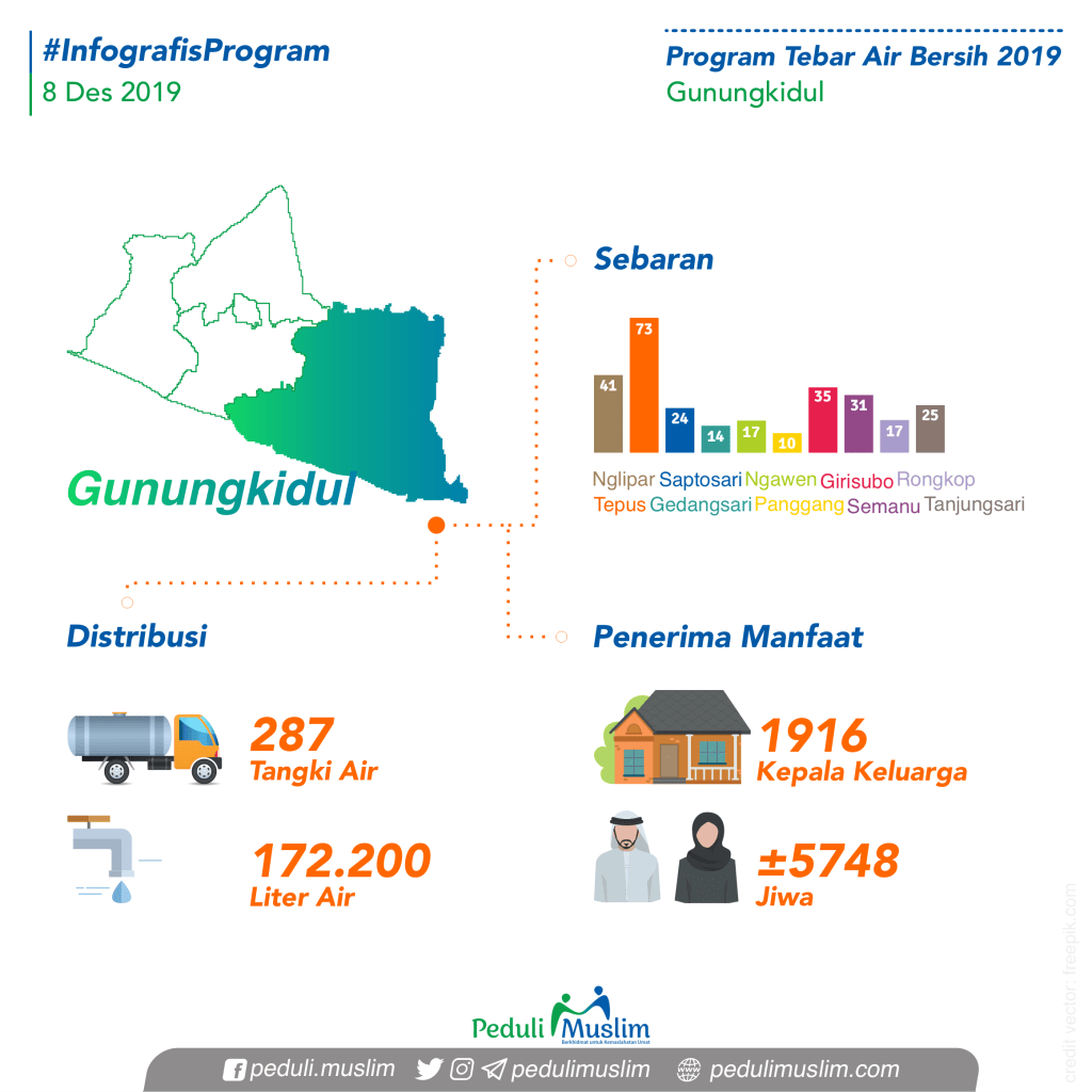 Alhamdulillah, donasi yang muhsinin titipkan melalui Peduli Muslim telah disampaikan dalam bentuk air bersih. Distribusi sebanyak 287 tangki air (truk tangki berukuran 5000 s.d. 6000 liter) atau sebanyak 172.200 liter telah terdistribusi sesuai dengan skala prioritas. Sebanyak 1916 KK atau sekitar ±5748 Jiwa (estimasi), dengan kecamatan terbanyak yang menerima distribusi air adalah Kecamatan Tepus, dan paling sedikit adalah Panggang.