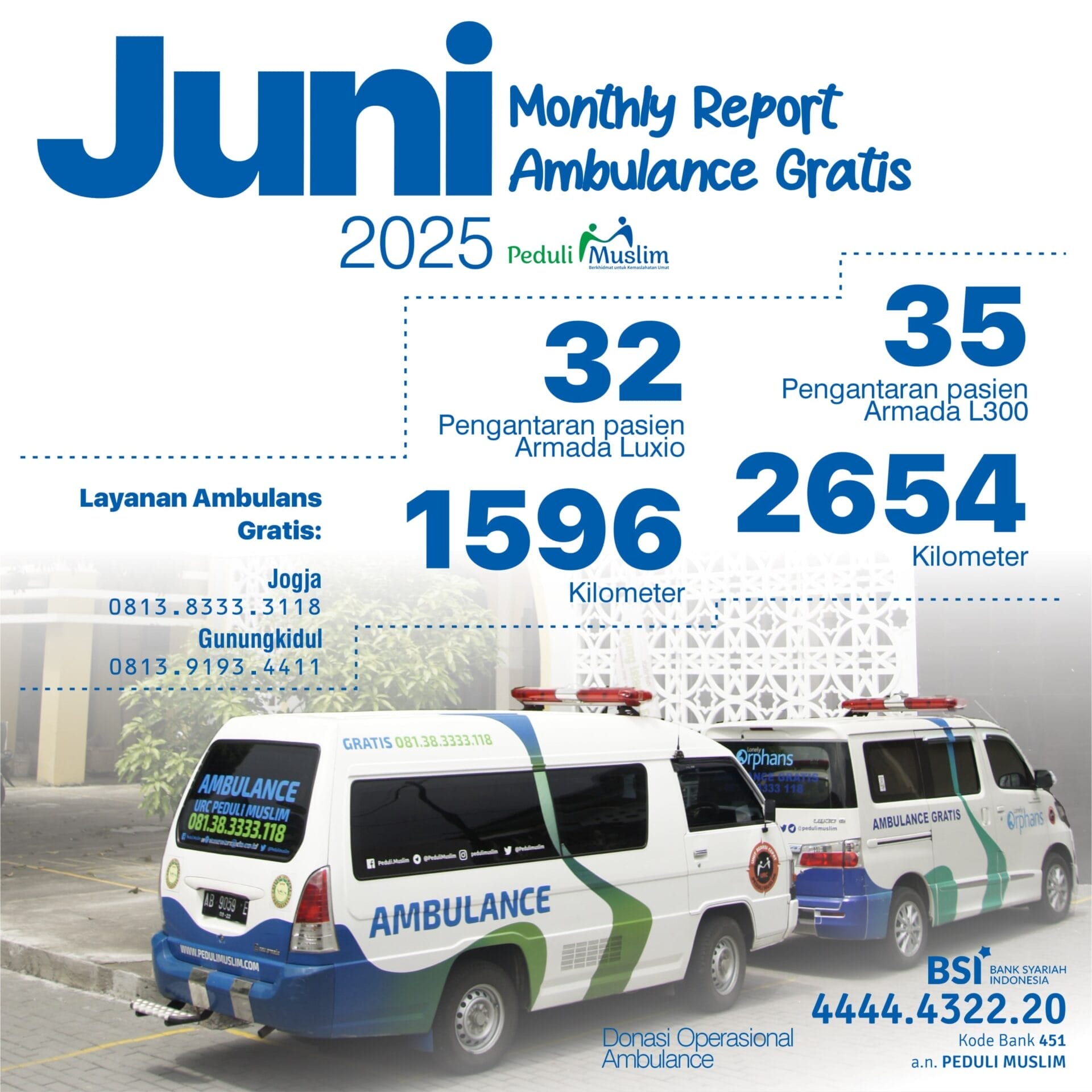 Berikut laporan penyaluran bantuan dari zakat maal, dhuafa & yatim, janda & muslimah, dan layanan ambulans gratis pada bulan Juni 2025.