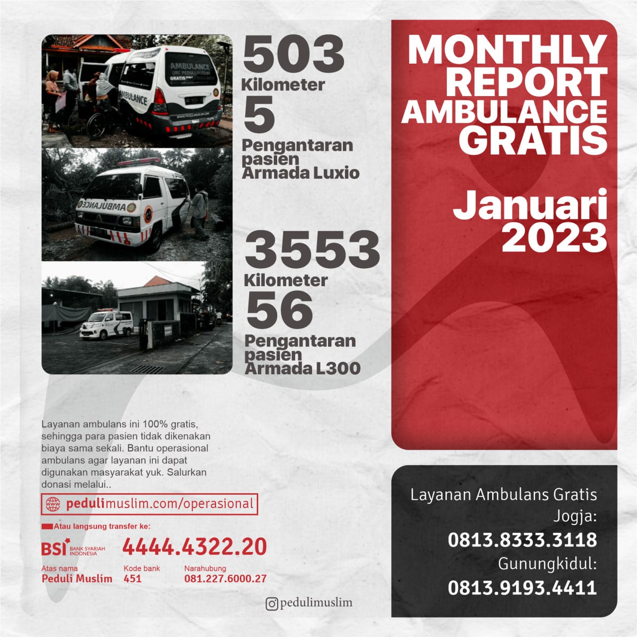 Jumlah pengantaran pasien Ambulance Wil Ops Jogja ialah 5 trip/perjalanan, dengan jarak tempuh mencapai 503 Kilometer. Sedangkan untuk jumlah pengantaran pasien Ambulance Wil Ops Gunungkidul ialah 56 trip/perjalanan, dengan jarak tempuh mencapai 3553 Kilometer.