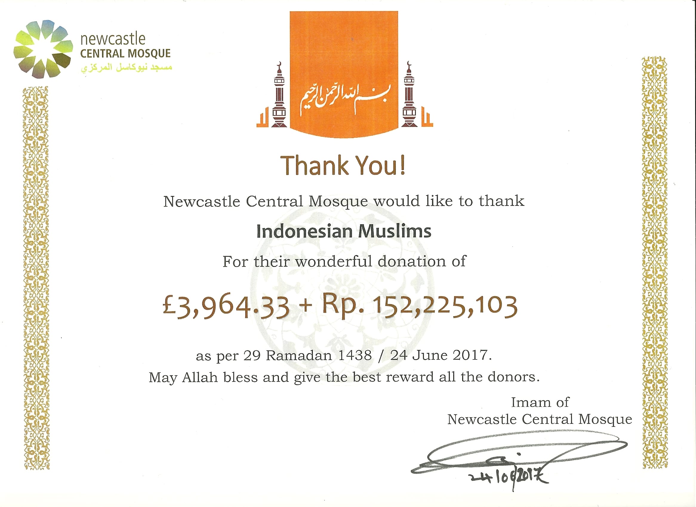 Alhamdulillah, Peduli Muslim, Al-Imanu (Indonesian Muslim Association Newcastle upon Tyne), dan Newcastle Central Mosque telah berhasil mengumpulkan donasi sebesar Rp. 218,488,851 atau setara dengan £12,897* dari masyarakat Indonesia pada campaign #BantuMasjidNewcastle. Jumlah donasi tersebut merupakan jumlah yang telah dikumpulkan dan diterima oleh Newcastle Central Mosque pada 24 Juni 2017 / 29 Ramadan 1438 H. Tak kurang dari 373 donatur yang terlibat dalam campaign yang telah berlangsung selama 23 hari ini.