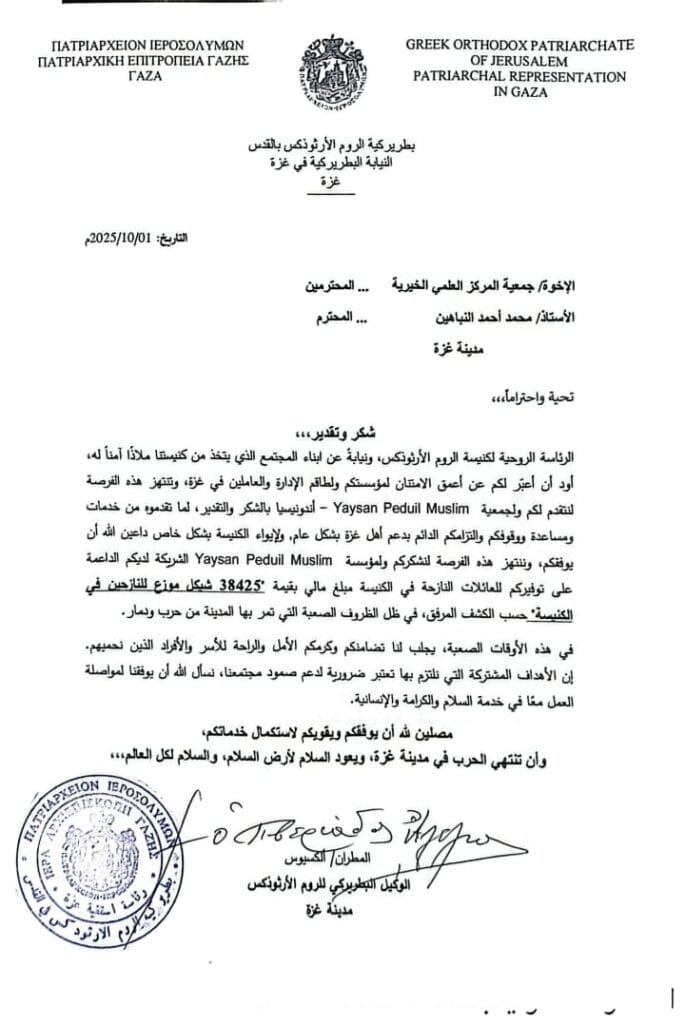 Ucapan Terima Kasih Pimpinan Gereja Orthodox Yunani Patriarkat Jerussalem di Gaza kepada Peduli Muslim atas Bantuan Kemanusiaan di Gaza yang Juga Dirasakan Umat Nasrani di Gaza