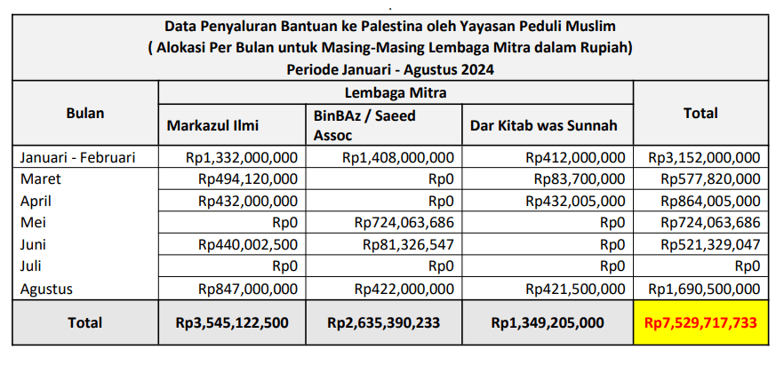 Penyaluran bantuan kemanusiaan ke Gaza terus berlangsung hingga saat ini, berikut laporan Semester awal, Januari s.d. Agustus 2024. Total bantuan yang disalurkan ialah Rp7.529.717.733 atau terbilang tujuh milyar lima ratus dua puluh sembilan juta tujuh ratus tujuh belas ribu tujuh ratus tiga puluh tiga rupiah.