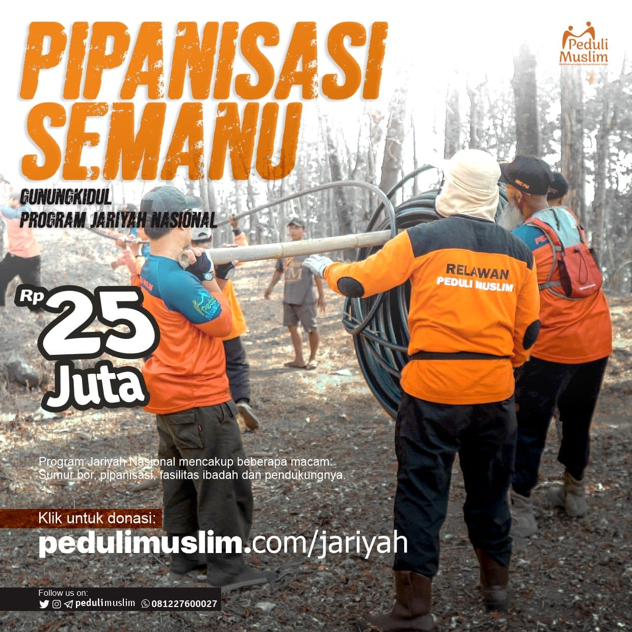 Sabtu 2 Maret 2024, Peduli Muslim merealisasikan donasi dari Program Jariyah Nasional. Penggalangan donasi ini dilakukan sejak 8 Februari 2024 dengan tajuk Pipanisasi Semanu dengan target RAB senilai Rp25.000.000,00.