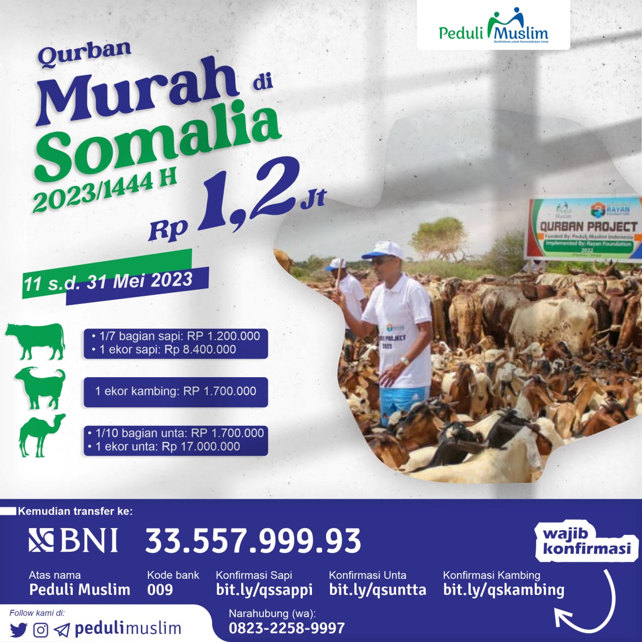 Insya Allah, di tahun ini (1444 / 2023) Tim Peduli Muslim kembali membuka Program Tebar Qurban di Somalia, Afrika Timur, untuk membantu penduduk di sana yang menghadapi kekeringan, stunting anak, & musibah kelaparan massal. Pemesanan hewan qurban Termin Ke-2 dapat dilakukan mulai hari ini: