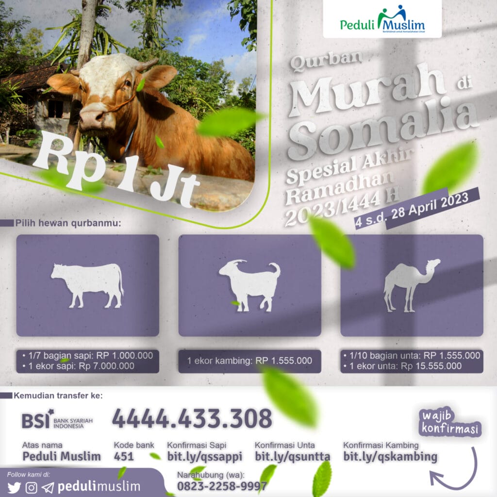 Insya Allah, di tahun ini (1444 / 2023) Tim Peduli Muslim kembali membuka Program Tebar Qurban di Somalia, Afrika Timur, untuk membantu penduduk di sana yang menghadapi kekeringan, stunting anak, & musibah kelaparan massal. Pemesanan hewan qurban, dapat dilaksanakan sejak sekarang, dan kami membuka harga khusus 10 hari terakhir Ramadhan & Awal Syawwal, yaitu: