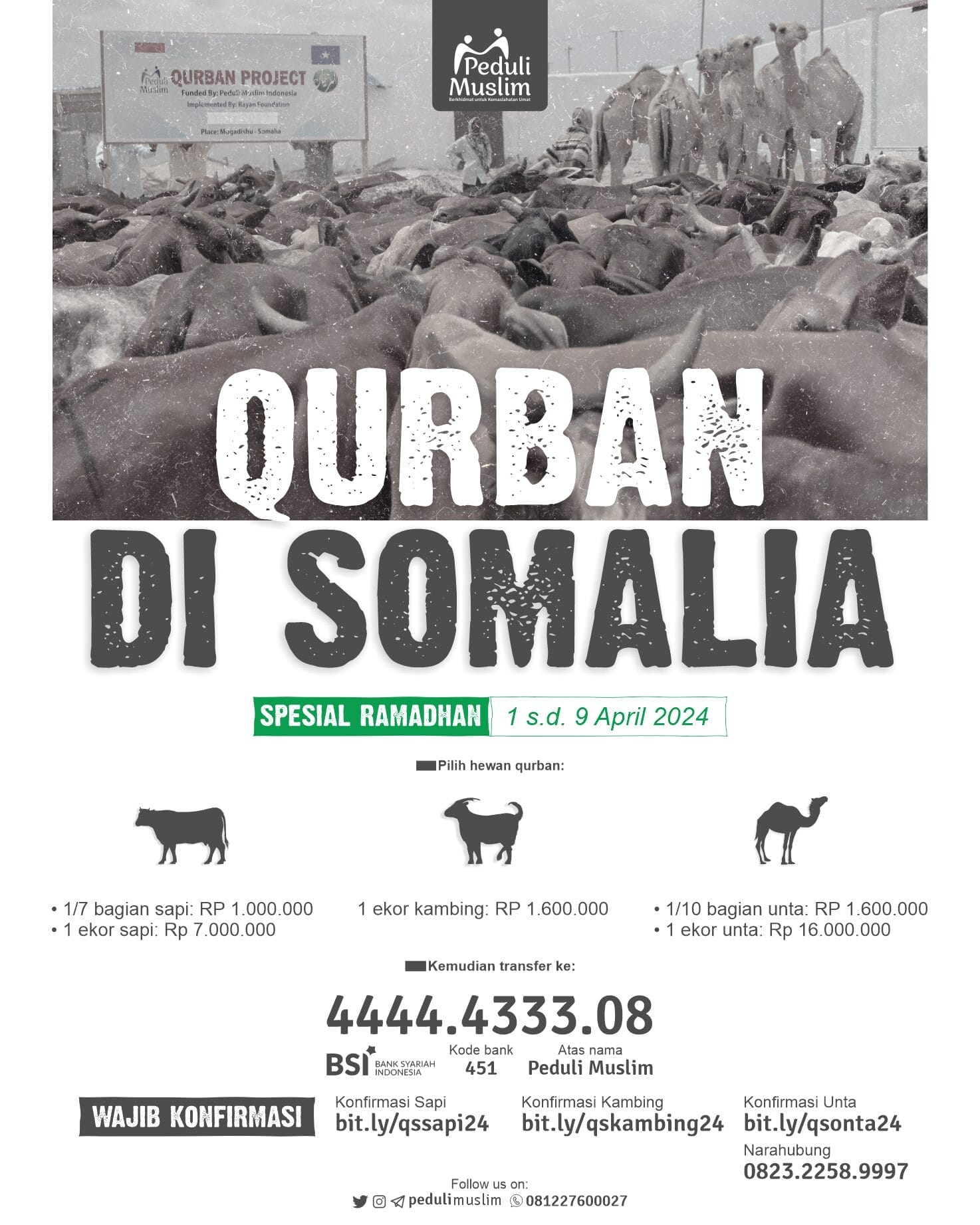 Insya Allah, di tahun ini (1445 / 2024) Tim Peduli Muslim kembali membuka Program Tebar Qurban di Somalia, Afrika Timur, untuk membantu penduduk di sana yang menghadapi kekeringan, stunting anak, & musibah kelaparan massal. Pemesanan hewan qurban, dapat dilaksanakan sejak sekarang, dan kami membuka harga khusus 10 hari terakhir Ramadhan, yaitu:
