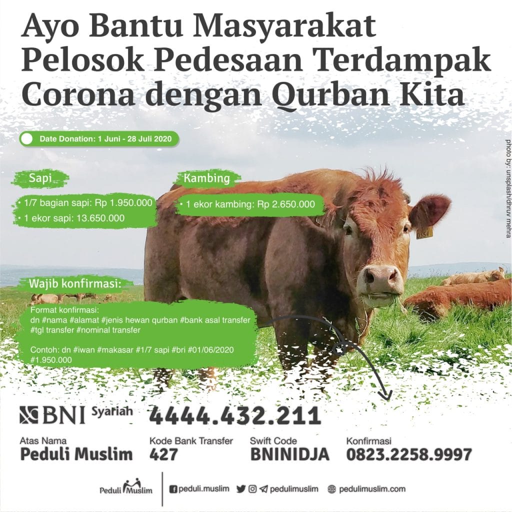 Setelah Ramadhan dan Idhul Fitri 1441 / 2020 berlalu, pandemi corona masih belum menunjukkan tanda akan usai. Semakin banyak masyarakat yang kondisi ekonominya terdampak dari pandemi ini. Sulit dibayangkan momen Idhul Adha yang sebentar lagi tiba, bagaimana masyarakat merayakannya. Padahal, sebelum ujian corona ini muncul saja, kami dapati banyaknya daerah di pelosok tanah air yang tidak bisa menyelenggarakan penyembelihan qurban secara maksimal, karena lemahnya kondisi ekonomi penduduknya.