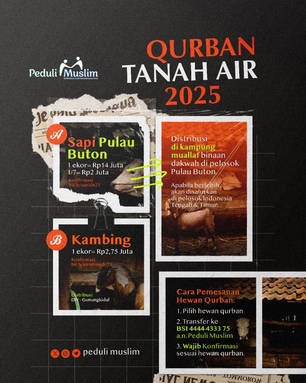 Pada tahun 2025/1446 ini insyaallah Peduli Muslim akan membuka kesempatan berqurban di beberapa daerah. Untuk qurban hewan sapi akan dilaksanakan di Pulau Buton, hewan kambing akan dilaksanakan di Gunungkidul.