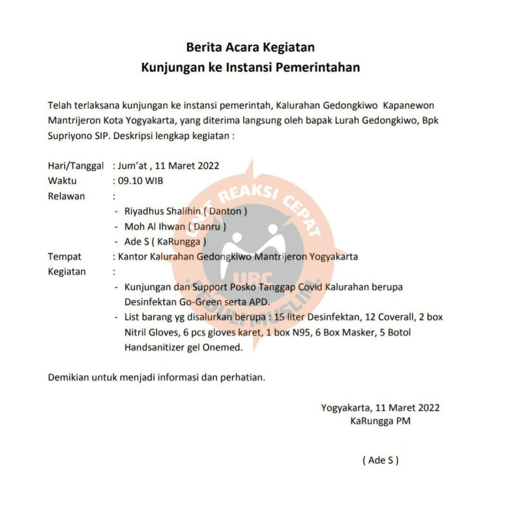 Support APD covid-19 dan bahan pendukung lain ke Kalurahan Gedongkiwo, Kapanewon Mantrijeron (lingkungan Kantor Peduli Muslim, Yogyakarta). Giat ini dilakukan atas dasar, angkat kasus covid-19 di DIY masih tinggi dibandingkan angka nasional, serta di lingkungan kantor Peduli Muslim sendiri terdapat banyak kasus positif.
